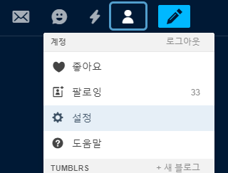 먼저 텀블러에 로그인을 하신 뒤 오른쪽 상단의 메뉴를 눌러 "설정" 부분에 들어가 주세요