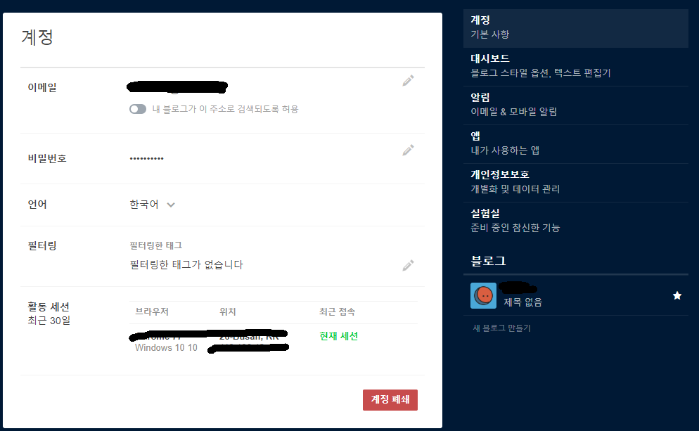 이 곳에서 가장 아래쪽 빨간색으로 표시된 "계정 폐쇄" 버튼을 눌러주세요