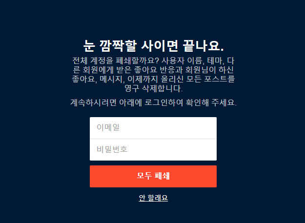 보시는 것 처럼 계정 폐쇄를 진행 하게 되면 사용자이름, 테마, 좋아요 및 메시지, 포스트 모든것이 삭제 됩니다.