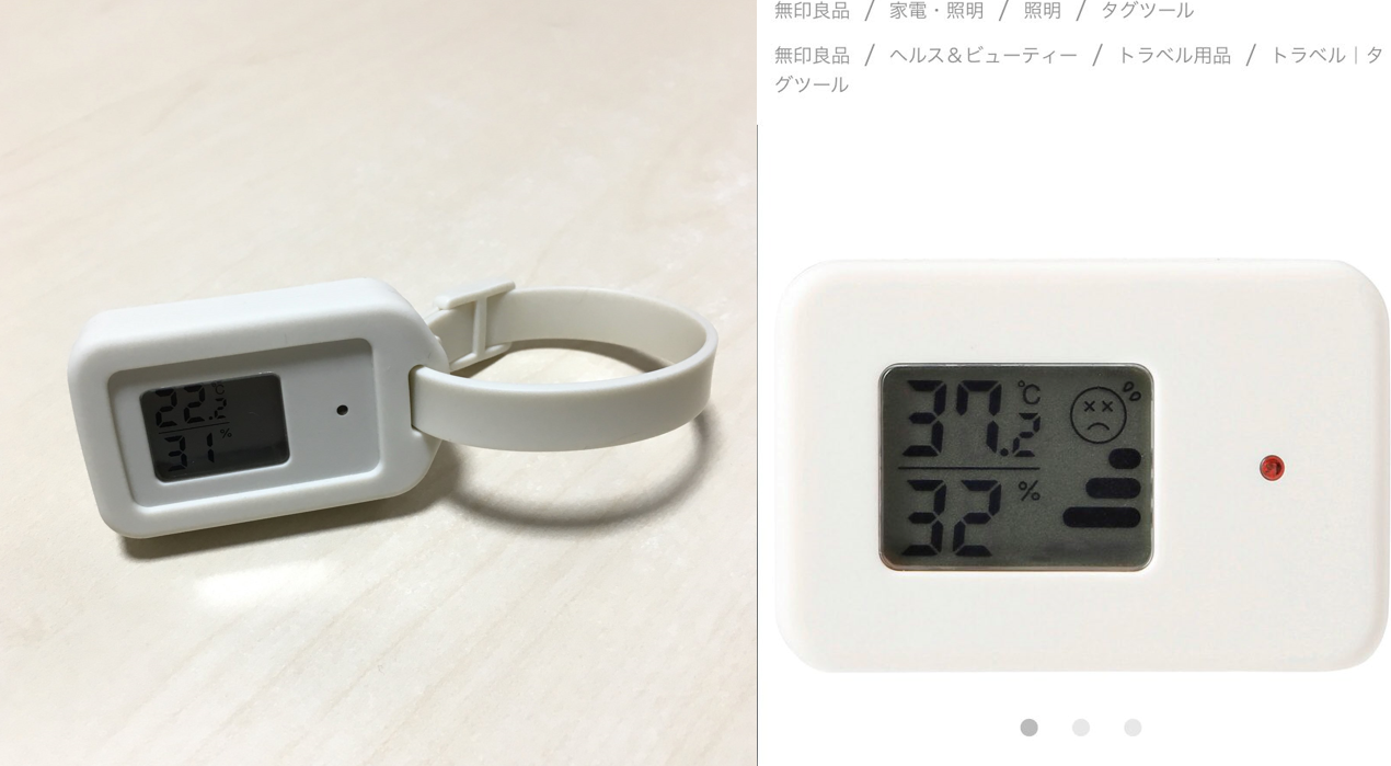 무인양품의 온습도계는 정말 편리한 아이템입니다. 온도 / 습도 를 한번에 체크 할 수 있고 태그에 탈부착이 가능해서 활용도가 높아요! 여행을 갈 때 캐리어에 넣어 가기에도 좋습니다. 옷을 보관할때, 여행지의 날씨와 습도를 빨리 파악하여 어떤 옷을 코디할지 생각할때에도 정말 도움이 됩니다.