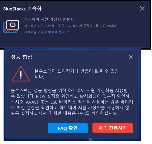 모바일 게임을 PC로 하기 위해서 꼭 필요한 프로그램 블루스택 이미 많이 알고들 계시죠? 그런데 블루스택으로 모바일 게임을 안정적으로 플레이 하기 위해서는 하드웨어 지원 가상화 작업이 필요하다고 합니다. 최초에 블루스택을 설치 할 경우 안내 메세지로 하드웨어 지원 가상화를 설정 하라는 메시지가 팝업 되게 되는데 만약 하드웨어 가상화를 설정 하지 않게 되면, 안드로이드 에뮬레이션으로 작동하는 블루스택 자체가 느려지게 되고 게임에 따라서는 실행이 되지 않거나 매우 느린 속도로 실행이 되는 경우가 자주 있습니다.
