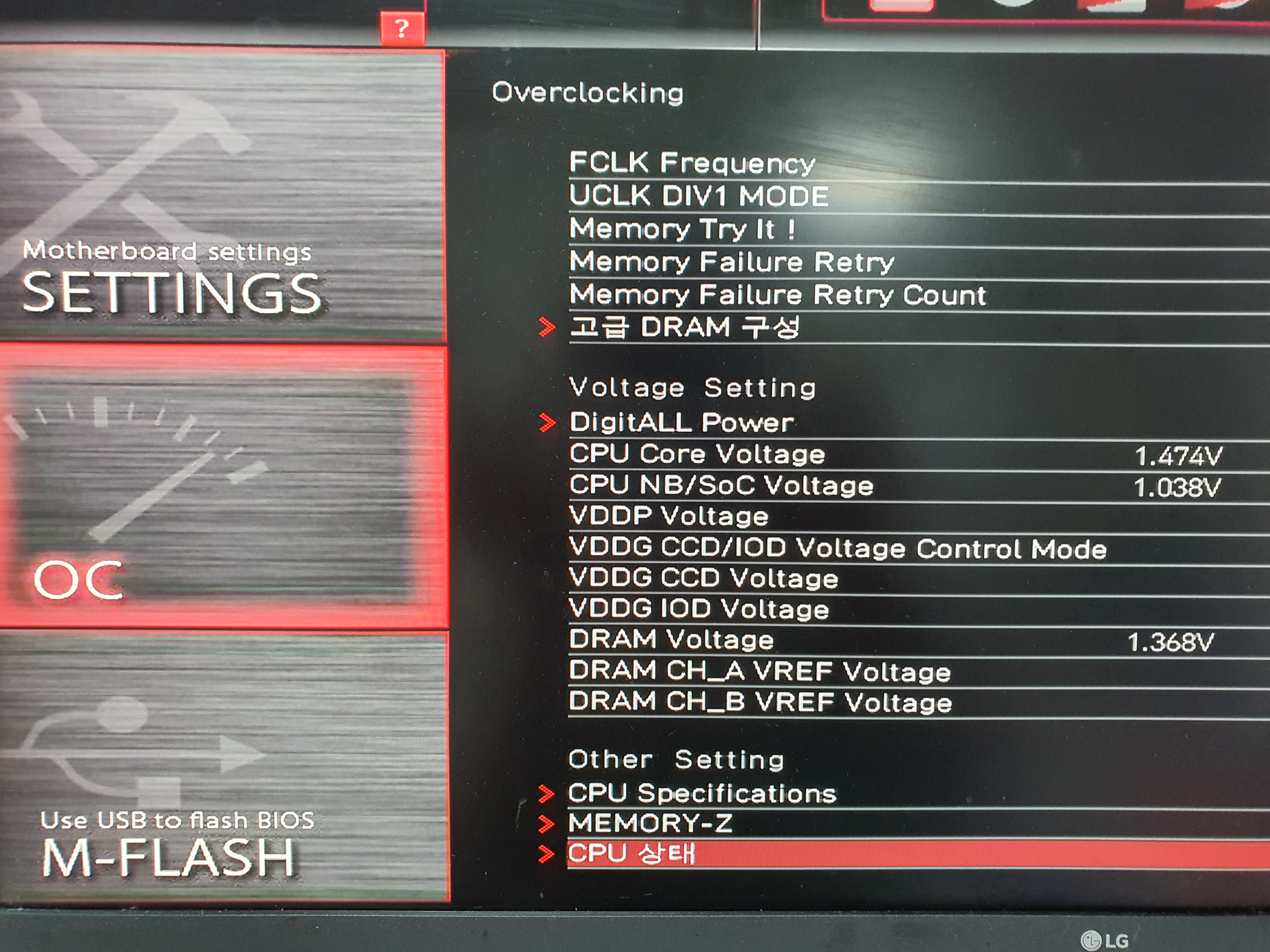 "OC" 메뉴로 들어가서 우측 메뉴를 쭉 내리다 보면 아래와 같이 [CPU 상태] 메뉴를 찾을 수 있습니다.