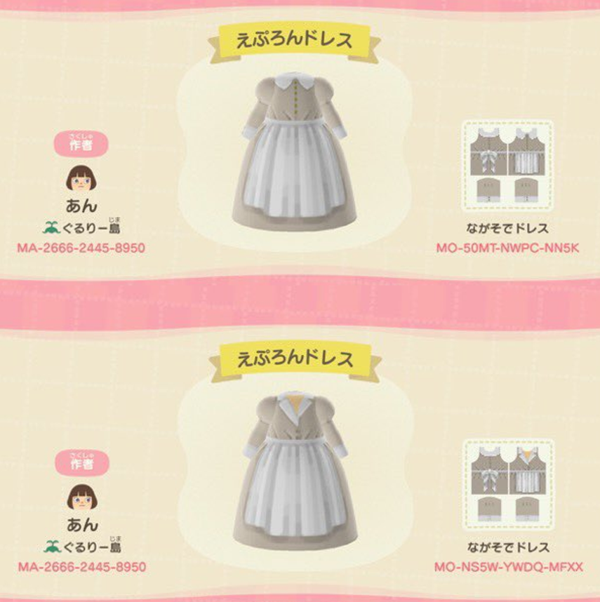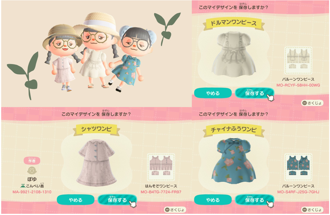 봄에 어울리는 원피스 3종 마이디자인 입니다. 봄은 이제 지나가고 있지만 예쁜 원피스를 입고 동물의 숲 세상에서 친구들과 피크닉을 즐기는 것은 어떨까요? 가벼운 재질의 귀여운 원피스 마이디자인 입니다!