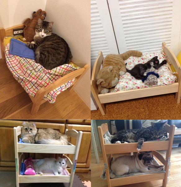 IKEA에서 살 수 있는 인형 놀이용 장난감 침대가 고양이들의 침대로 사용되고 있다고 합니다.