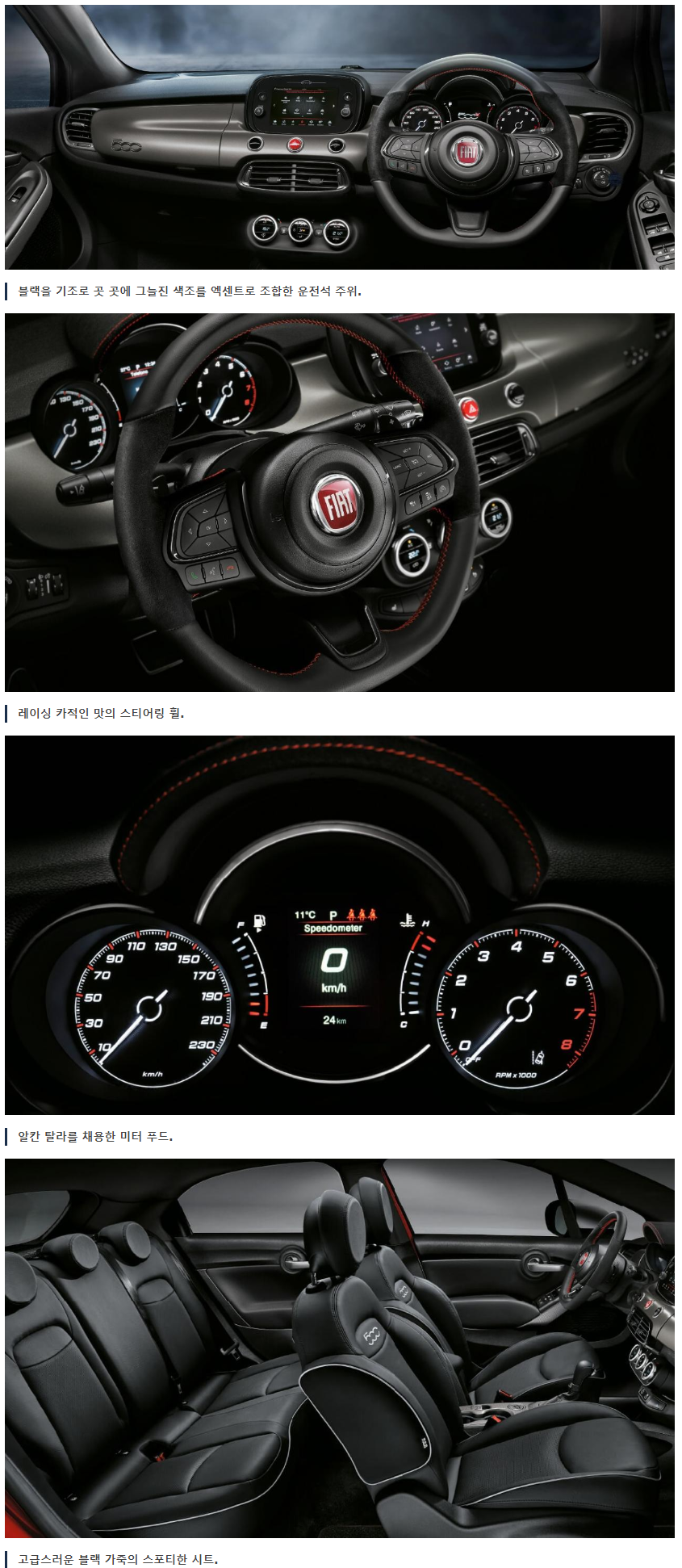 FCA재팬 측의 발표에 따르면 차량 자체의 전고 차이는 없으나 내부 쇼바와 서스펜션 세팅 및 시트포지션 세팅을 통해 기존 500X 모델보다 더욱 낮은 무게중심을 가질 수 있도록 설계 하였다고 한다. 트렁크 용량은 뒷좌석 폴딩시 1000L를 확보 할 수 있으며 소형 차량이지만 고급유 주유를 권장하고 있다.