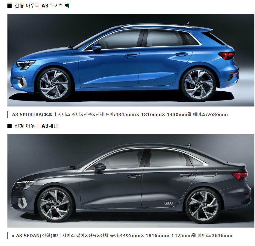 신형 A3 스포츠백과 세단의 비교 데이터도 있습니다.