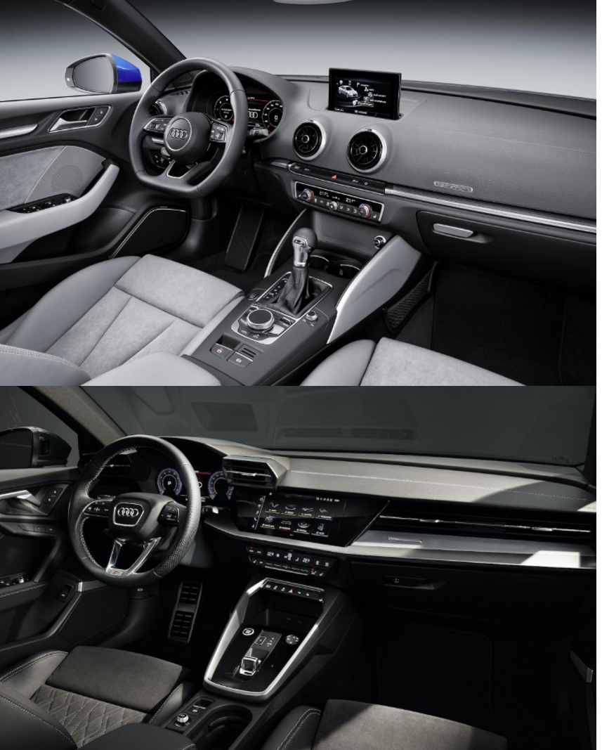 큰 차이를 보이는 인테리어는 아래 사진으로 비교해보실 수 있습니다. 상단이 구형 A3 세단의 인테리어, 하단이 신형 A3 세단의 인테리어 입니다. 구형도 나쁘지않지만 역시 신형이 핸들 부터 전체적인 인테리어 까지 세련되게 보입니다.