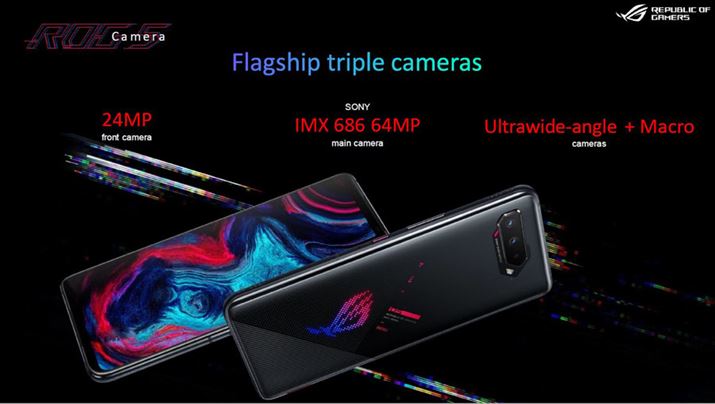 ROG Phone 5 시리즈의 카메라는 메인 카메라가 6400만 화소의 표준 카메라, 1300만 화소의 초광각 카메라, 그리고 매크로 카메라 총 3개의 렌즈를 가진 트리플 카메라 구성을 갖고 있습니다. 전면 카메라의 경우에도 2400만 화소의 카메라를 탑재함으로써 카메라 성능에 있어서도 뒤떨어지지 않는 기능을 갖고 있습니다. 이미지 센서의 경우 소니의 IMX 686을 탑재하여 해상력을 높였다고 합니다.