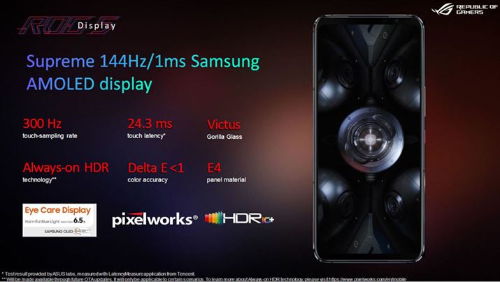 먼저 베이스 모델인 "ROG Phone 5"는 6.78인치 (2448x1080) AMOLED 디스플레이를 탑재하였습니다. 삼성의 패널을 활용하였으며 144Hz의 주사율을 지원, 터치 샘플링 레이트는 24.3ms로 고속 터치 조작에도 쾌적하게 플레이 가능한 스펙을 갖추었다고 설명하고 있습니다.