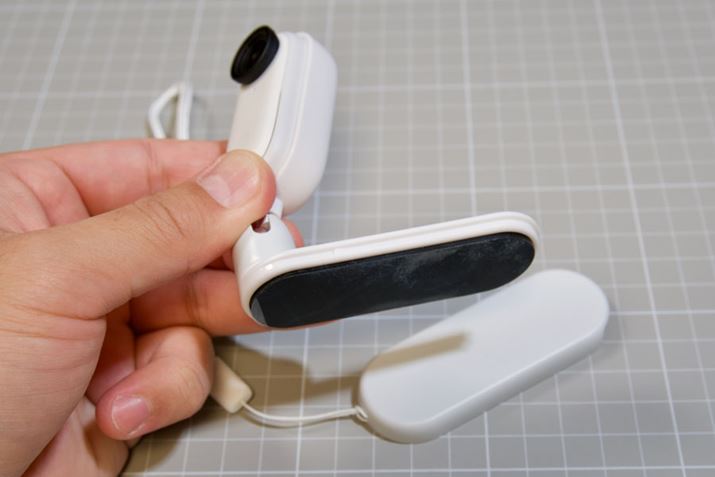 패키지 안에는 스트랩 장착이 가능한 전용 케이스, 충전을 위한 USB-C 케이블, 목걸이형 받침대, 벨트 클립 케이스, 카메라 본체, 컨트롤러 등이 들어있습니다. 본체 후면에는 충전을 위한 단자와 자석이 탑재되어 있습니다.