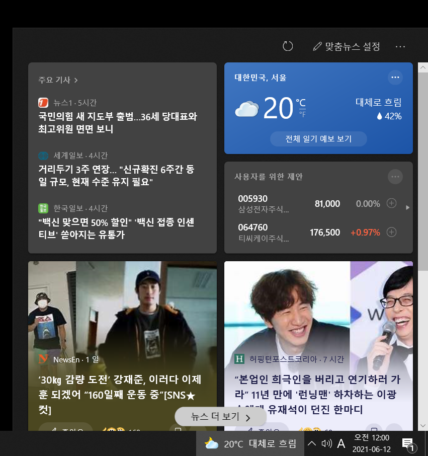 어느날 갑자기 윈도우 우측 하단, 작업표시줄 오른쪽에 이렇게 날씨가 표시되게 되었습니다.