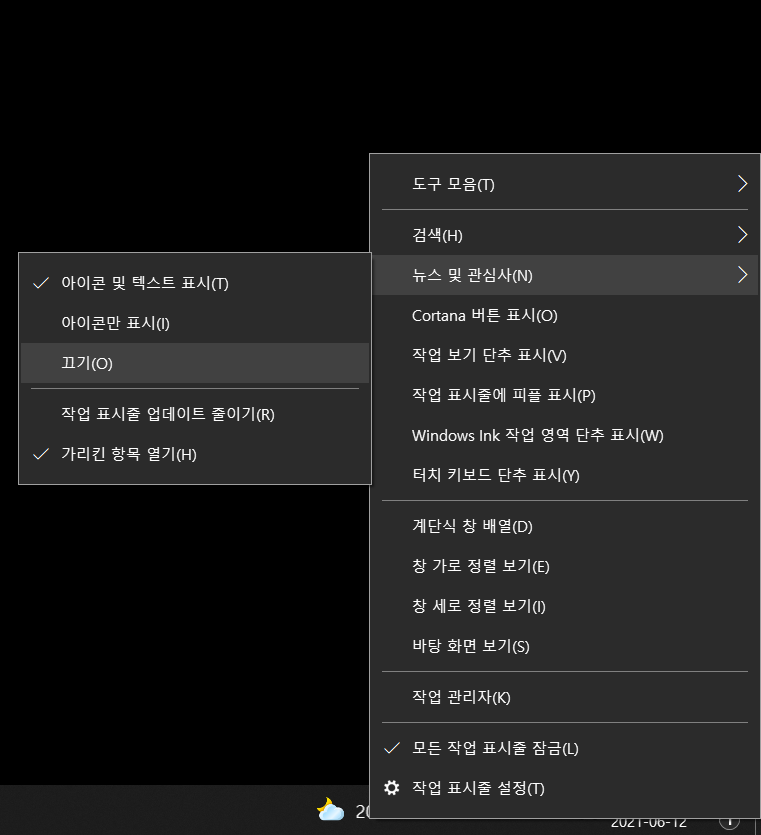 해당 기능을 끄기 위해서는 작업표시줄에서 설정을 해주는 것이 필요했습니다.