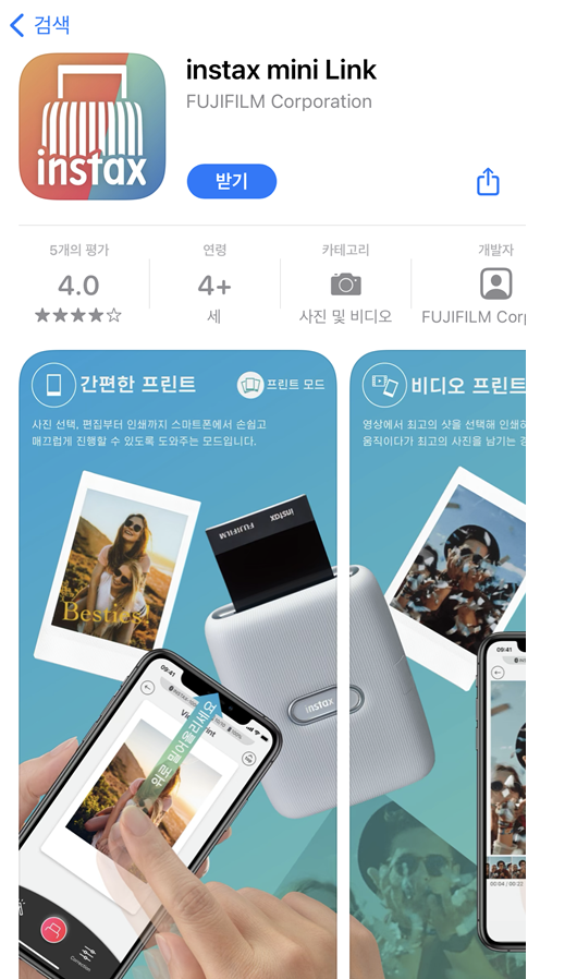 먼저 인스탁스 미니 링크의 기능을 사용하기 위해서 스마트폰에 instax mini link 앱을 설치하여야 합니다. 모든 기능들은 이 전용 APP을 통해서 조작하게 됩니다. 아래의 앱을 설치하고 인스탁스 미니 링크 본체와 스마트폰을 블루투스로 연동하게 됩니다.