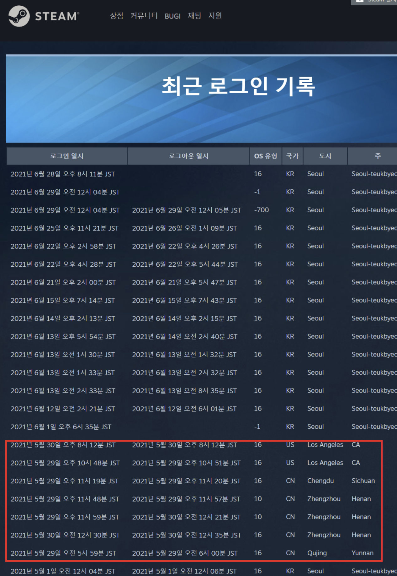 - 스팀 접속기록을 통해 해킹 사실을 증명 할 수 있도록 접속기록 사진을 첨부하는 것이 좋습니다.
