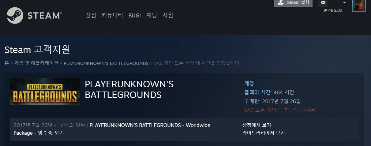 그동안 CS:GO, 배틀그라운드, 레인보우식스:시즈 등의 게임을 즐기면서 단 한번도 핵이나 버그를 쓴 적이 없었는데 VAC 차단이 되어 있는 것을 보고 계정을 세부 확인해보니 아니나 다를까 계정을 해킹한 해킹범이 배틀그라운드를 플레이 하면서 핵을 사용하고 바로 계정이 차단되어 배틀그라운드 게임 차단이 되었던 것이었습니다.