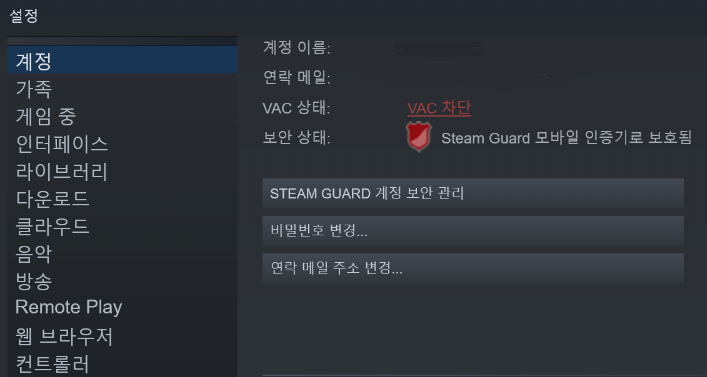 그런데 어느날 우연히 스팀-설정에 들어가보니 계정이 [VAC 차단] 상태인 것을 확인하게 되었습니다.