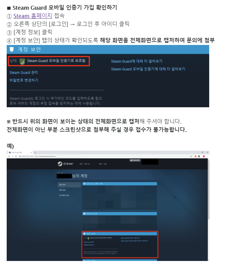 필요 접수 양식 : 문의 제목 / 동의 여부 / Steam 프로필 주소 / Steam Guard 모바일 인증기 가입 인증 스크린샷
