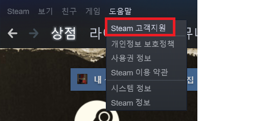 - [스팀] - 상단의 [도움말] - [Steam 고객지원] 선택