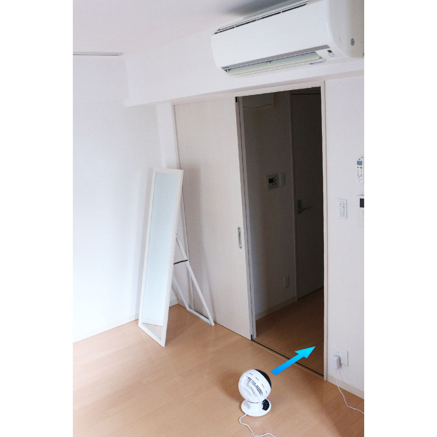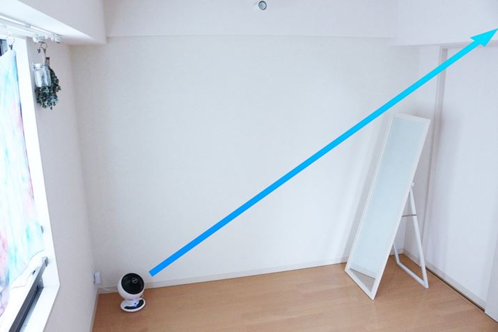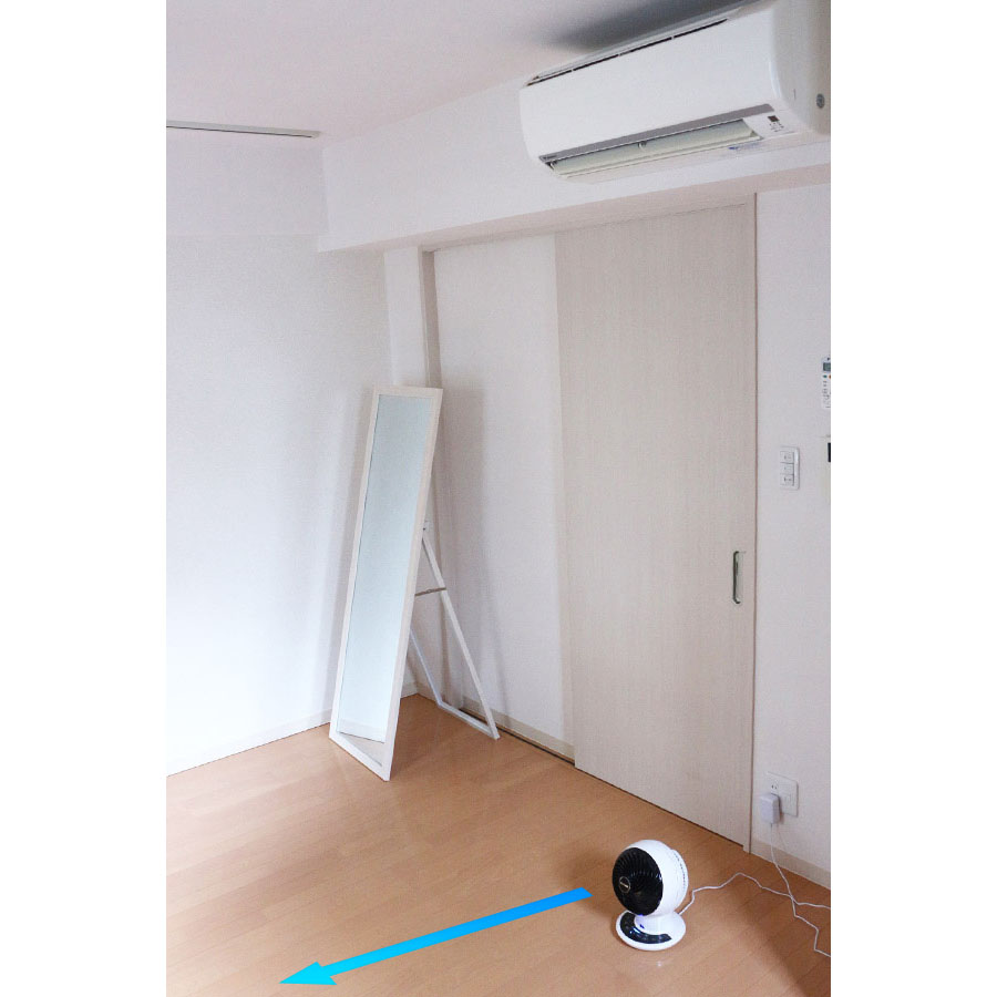 창문을 닫은 상태로 서큘레이터를 방 구석에 대각선 방향으로 두고 반대쪽 천장 모서리를 향하게 하여 사용하면 효율적으로 실내의 공기를 순환시킬 수 있습니다.