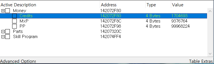 - 돈을 바꾸고 싶으면 Credits 메뉴의 Value 값을 더블클릭해서 숫자를 바꾸면 되고 MxP나 PP도 마찬가지입니다.