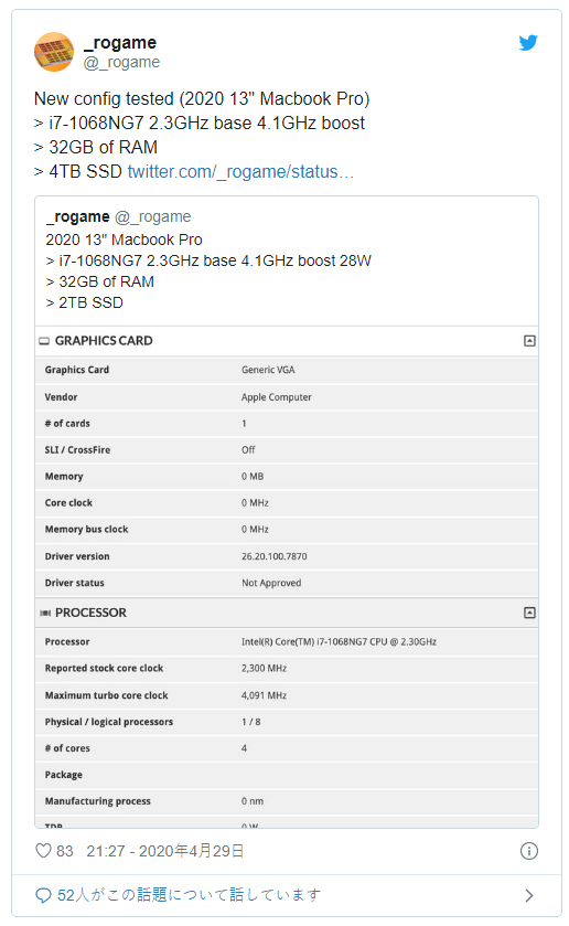 벤치마크 데이터에서 확인된 프로세서(CPU)는 기본 클럭2.3GHz(터보 보스트시 최대 4.1GHz)의 인텔10세대 프로세서 코어i7-1068NG7이며 인텔 10세대 코어프로세서의 U시리즈에 존재하지 않는 형태이기 때문에 애플용 커스텀일 가능성도 있다.
