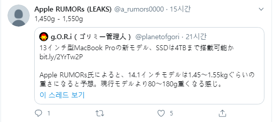 애플 관계자와 연결돼 있다는 Apple RUMORs 에 의하면 14.1인치 모델일 가능성이 높다고 전망했다.무게는 1.45~1.55kg이 될 것으로 보여 현행 모델보다 80~180g 무거워진다고 한다.