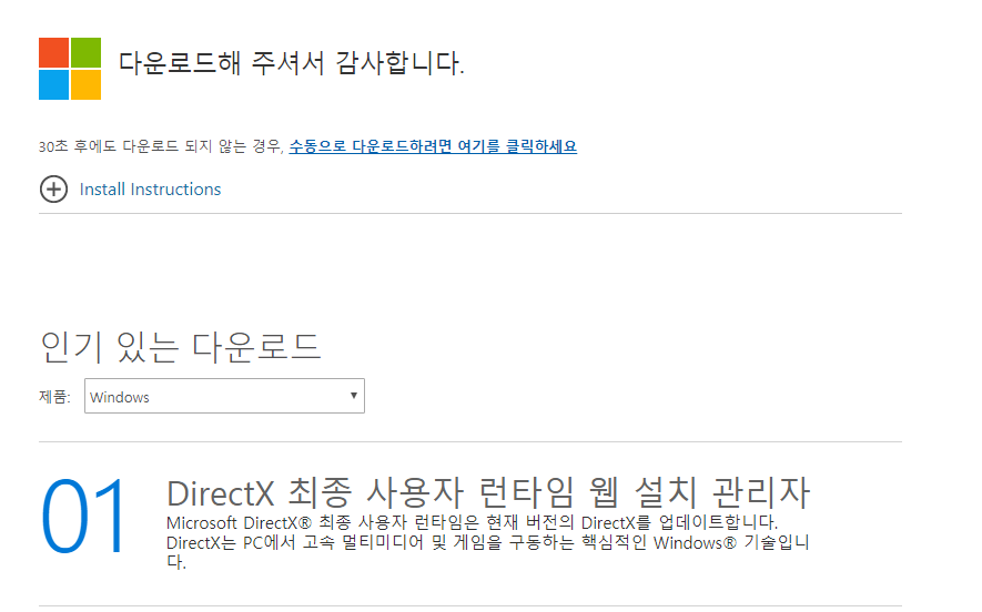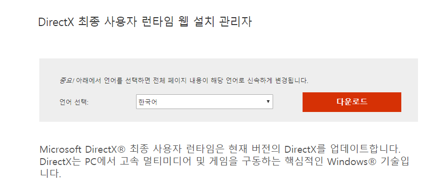 먼저 마이크로소프트 공식 홈페이지에서 DirectX 를 설치 할 수 있습니다.