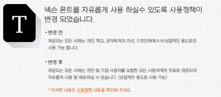 넥슨에서 작년 배포 하였던 무료 폰트 5종의 사용 정책을 변경 하면서, 개인 및 기업 등의 사용 제한이 사라졌습니다.